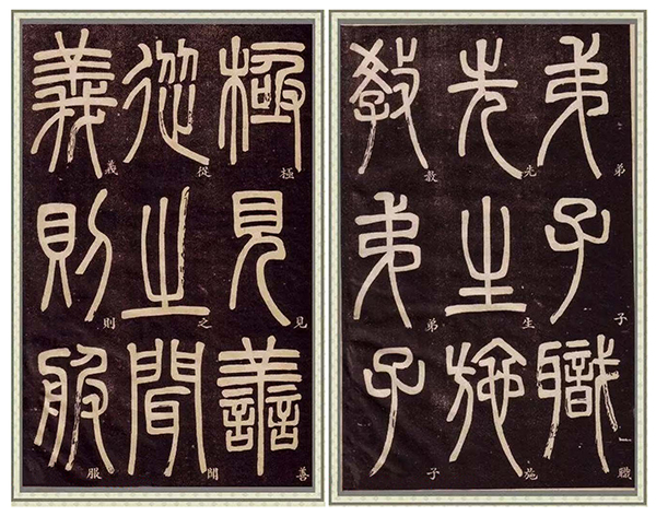 梅氏是江左望族,收藏秦漢以來金石拓本甚富,鄧石如在梅家得以飽覽古代石刻拓本,各大家碑帖每種臨摹百本。又因篆體不備,遂發奮旁搜三代鐘鼎,秦、漢瓦當、碑額。砥礪苦學五年,乃學篆書成,手寫《說文解字》二十本,半年完成。后學漢分,大饗諸碑,各五十本,三年,分書始成。 在這番系統臨習后,鄧石如的書法步入正軌。后人思之書藝造詣,與其長期刻苦磨練是密不可分的。沙孟先生說:“清代書人,公推為卓然大家的,不是東閣學士劉墉,也不是內閣學士翁方綱,偏是那位藤杖芒鞋的鄧石如。”湖光總督畢沅對鄧石如也十分欽佩,他曾說:“山人,吾幕府一服清涼散也!”一位布衣書家,受到如此贊譽,并被后人公認為中國書法史上開宗立派的大家,可見其對書法篆刻藝術的貢獻,甚至可以與王羲之、顏真卿等比肩,值得我們不斷地深入學習。