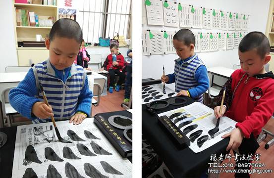 我們在水寫帛上書寫得不亦樂乎,手臂力量也在慢慢增長,原來不聽話的毛筆現在和我成為好朋友了,請您看看我這個「瓜子點」是不是也很棒啊!
