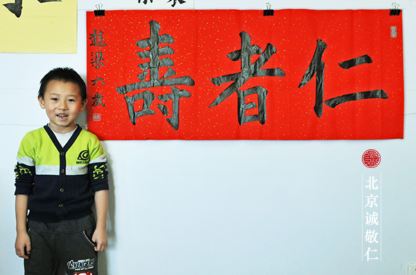 通過半年全天書法教室的學習,劉同學的進步是很顯著的,從寫筆畫的練習,直躍到字體的書寫,等到年節時已經可以在紅紙上寫作品了。今年回老家,直接在裁好的紅紙上寫「?!棺帧R驗楹⒆幽昙o小,大人們聽說他寫「福」字,都饒有興致的來看。看到孩子擼起袖子鄭重其事寫字的樣子,真是又可笑又認真的場景。有大人說,先別說字寫的怎么樣,看他拿筆的架勢,好像就很會寫的勁頭哪。字寫出來確實很端正。