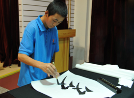 來自青海玉樹的同學,是一位憨厚的藏族學生,年僅十四歲。接受我們的采訪時,紅撲撲的臉上始終洋溢著動人而淳樸的笑容。為期三十多天的學習,朋措從書法的基本筆畫一直學習到書法字。在老師們的悉心教導下,在「永字八法」的科學引導下,朋措常常揮毫到深夜還戀戀不舍,忘我地愛上了書法,愛上了太極。更令人歡喜的是,在書法和太極的熏習中,朋措發現了學習的法寶——靜定,并高興地說:「靜定功夫能讓上課聽講專心,進步很快?!瓜嘈胚@個回答是最令老師欣慰的回報。而小院餐廳為大家提供的健康素食,令朋措更是如獲至寶地說,回家以后不想吃肉了。學習生活的收獲,讓小朋措學會了感恩和付出,無怪乎,餐廳里常常見到他穿梭的身影,擦桌子、擺椅子,忙得不亦樂乎,這份勞動的歡喜,也是學習班傳授給孩子和家長的法寶啊。
