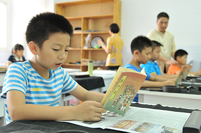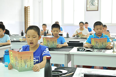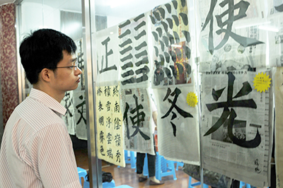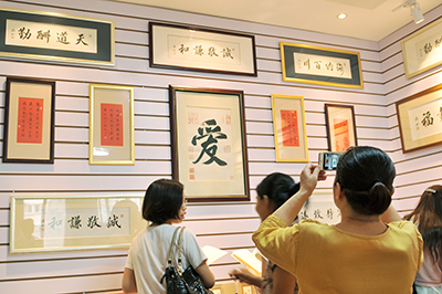 課余期間,學員們穿梭于教室之中,新奇的翻閱傳統(tǒng)文化產品,欣賞墻上一幅幅書法及彩繪作品。長廊兩側掛滿了書法學員的練習作業(yè),記錄了他們快樂學習書法的成長歷程。