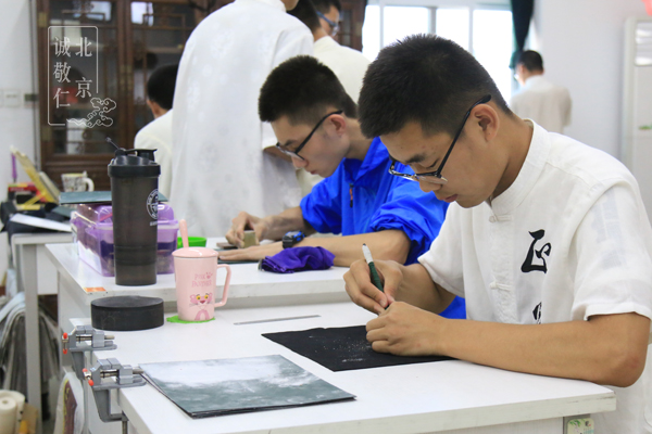 現(xiàn)場采用實(shí)物投影技術(shù),一邊示范一邊詳細(xì)講解,方便同學(xué)們直觀了解要領(lǐng),有疑問時(shí)可隨時(shí)抬頭觀看回放。 磨平印面:去除浮躁,磨平心性 學(xué)習(xí)步驟先從磨平印面開始,對于初學(xué)者來說,一方石頭六面都磨平也不是一件簡單的事情,在老師耐心指導(dǎo)與嚴(yán)格要求下,同學(xué)們耐住性子,在磨石中慢慢磨平了心性,對力道的掌控也有了精準(zhǔn)敏感度,在反復(fù)觀察印面是否方正的過程中也不斷提升著精準(zhǔn)的眼力。