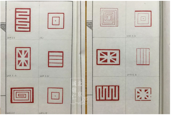 作業(yè)印譜本上滿滿的印章,記錄著大家認(rèn)真的付出。 嚴(yán)格要求初學(xué)者至少完成六方形狀各異的直線圖案,經(jīng)老師檢查過關(guān)后方可進(jìn)入下一關(guān)。
