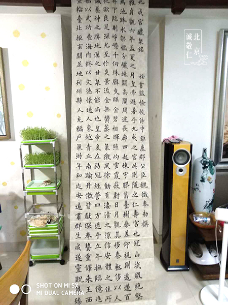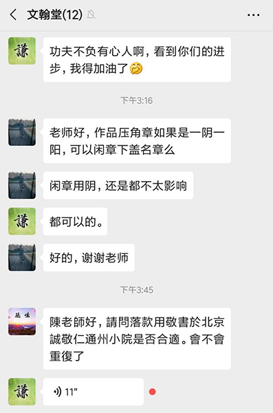 ![]() ![]() 陳同學在江蘇恭書《心經》 習書一年 基礎訓練的牢固,使她在臨習其他書體時進度快了很多,當然也離不開每日的練習。右邊是她寫的《愛蓮說》局部圖。 ![]() ![]() 張同學的書房(江西)也掛著楊老師的吉祥語 她在6月6號的日記上寫到:努力些,總是可以達到的,早晚的事。就如近日習練書法,先有大致的作品安排,寫時就安住手頭的那個字,才容易產生些許的進步。真的欠缺遇事時的鎮靜工夫。 5.一些好玩的 新六藝班的線上書法指導,會在微信群里進行,且每天到知識圈打卡學習心得。 文翰堂是二屆男生的小天地。