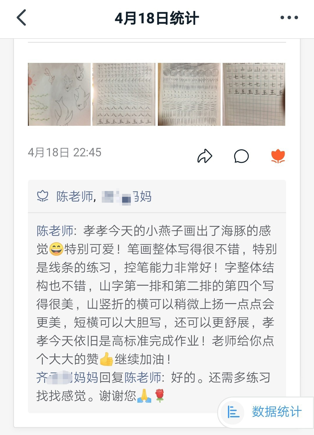 第四期:基本筆畫(huà)和基本字練習(xí) 有了前面三期的基礎(chǔ)練習(xí),孩子們對(duì)控筆有了很大的提升,所以在第四期開(kāi)始學(xué)習(xí)基本的筆畫(huà)和基本字,因?yàn)椴糠趾⒆訉?duì)軟筆有一定基礎(chǔ)和練習(xí),所以在講解硬筆筆畫(huà)時(shí)采用軟筆書(shū)寫(xiě)的方法(如,軟筆:小點(diǎn)下筆,筆毛漸漸鋪開(kāi),頓一下,筆根壓住邊拉邊轉(zhuǎn),收筆頓筆,是一個(gè)由小變大的過(guò)程。硬筆:小點(diǎn)下筆往下拉,停一下頓筆,漸漸加重邊拉邊轉(zhuǎn),收筆停一下頓筆,是一個(gè)由輕到重的過(guò)程。讓孩子們感受到軟硬筆的練習(xí)是相通的,在硬筆中感受筆畫(huà)中輕重停頓的重要性。)所以在第四期中,線條練習(xí)加入了線條粗細(xì)變化練習(xí)(輕重輕、輕重重輕),讓孩子們更有針對(duì)性地進(jìn)一步提升控筆的能力。第四期練習(xí)除了講解基本筆畫(huà),字的練習(xí)是漢字中的數(shù)字練習(xí),起到一個(gè)承上啟下的作用,讓孩子對(duì)數(shù)字又有一個(gè)新的認(rèn)識(shí),每天學(xué)習(xí)一個(gè)漢字?jǐn)?shù)字,還會(huì)練習(xí)本期軟筆課程中練習(xí)的字,讓孩子對(duì)這個(gè)字的結(jié)構(gòu)更加熟悉,做到軟硬筆相結(jié)合練習(xí)。 ∷∷ 第四期 部分作業(yè)打卡 ∷∷