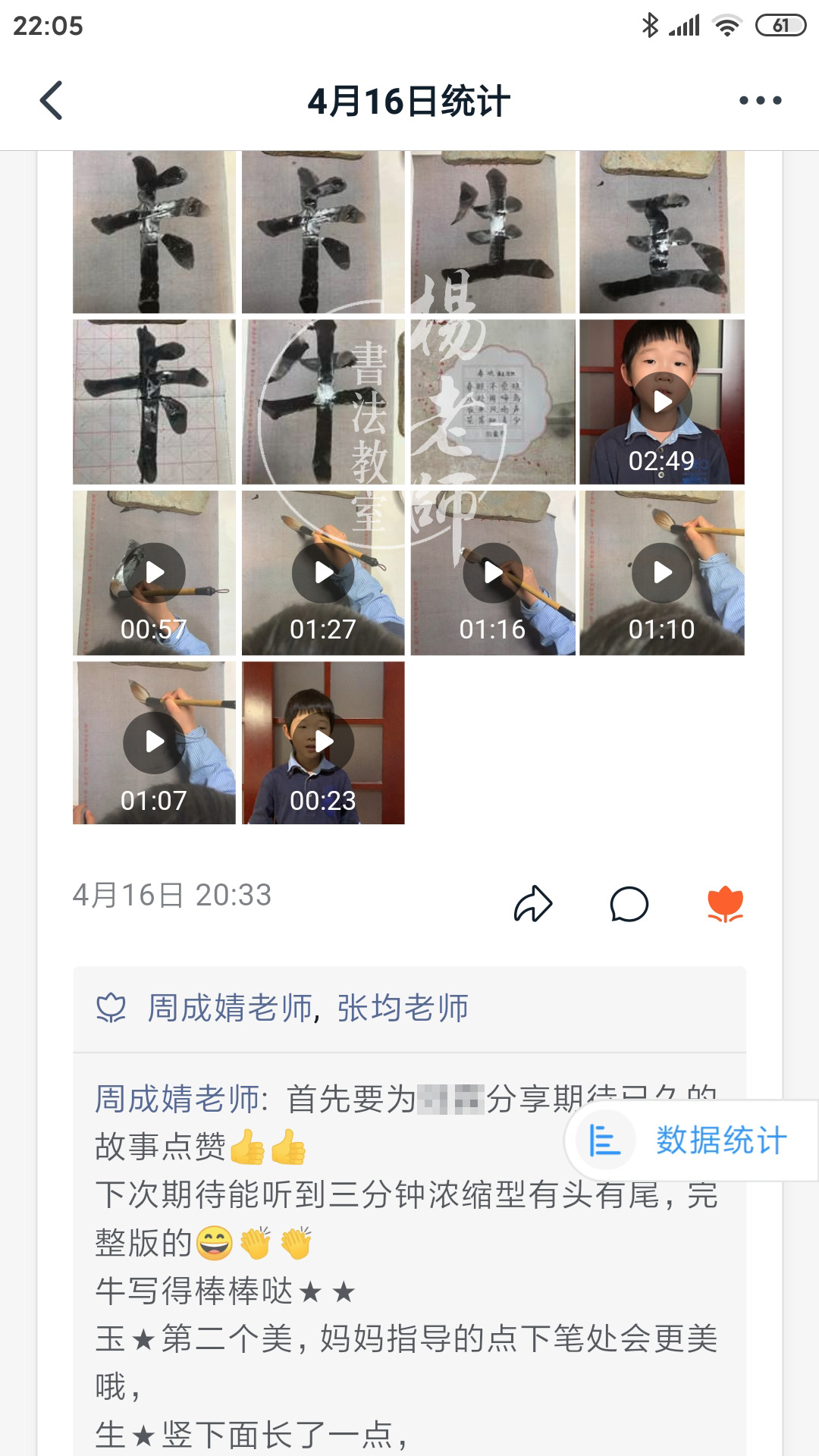 「楊老師書法教室」線上課,至今已經第五期進行中,二兜是從第二期開始參加周老師班的線上一對一課程。每期十天,每天一個小時的課程里,以軟硬筆相結合的教學形式,從興趣出發,了解文字的演變過程。 上半堂的硬筆課,從基本筆畫到基本字(內容選取小學一年級教材),目的是為了進入小學前,扎實學生的基本功,了解字的結構和書寫比例,通過不斷的練習與老師的督促,學生會慢慢地掌握要領。 下半堂課軟筆無墨書寫(也叫:水寫帛上的毛筆字練習),教學內容:復習基本筆畫與基本字,讓軟筆與硬筆在有限時間,得以重新復習鞏固提升進步。 學生以打卡的方式,每日呈交作業,指導老師線上點評、糾正作業。 ▼ ![]()