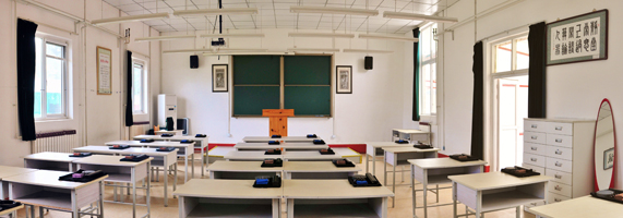 教學(xué)區(qū)的書法教室里,窗明幾凈,室內(nèi)為大家配備了空調(diào)暖氣設(shè)備,以便學(xué)員在不同季節(jié)都能舒適地學(xué)習(xí)。同時教室裝有先進(jìn)的多媒體教學(xué)設(shè)備,為大家提供豐富多元的書法教學(xué)。懸掛于講臺兩側(cè)的孔老夫子像,給教室?guī)頋夂穸f嚴(yán)的敬學(xué)氣氛。墻壁兩側(cè),楊淑芬老師親筆書寫的墨寶「感恩與祈盼」以及「八榮八恥」,如同老師的諄諄誨勉,鼓勵著學(xué)子們德藝雙修。在干凈整潔的課桌上,整齊地擺放著大家學(xué)習(xí)用的文房四寶,墨香縈繞。
