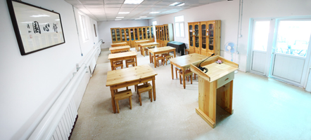 清靜而整潔的兒童書法學(xué)習(xí)區(qū),位于高大的白樺樹旁。明亮的教室里,井井有條地擺放著可以調(diào)節(jié)高度的桌椅;