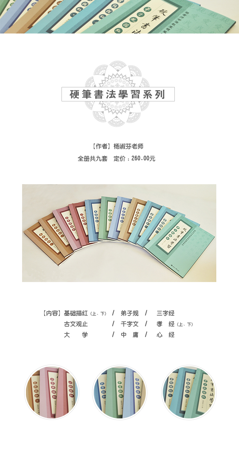 一本好帖,就是與一位明師相依,一位善友為伴。楊老師書法教室硬筆書法描紅系列,書寫規范,字體端莊舒朗,充滿活力;字體書寫的節奏鮮明,易于辨認,筆觸清晰,結體嚴謹自然,是初學者進行書法扎根的良好教材。 此系列描紅的編排,由基本筆畫開始,逐步進階到偏旁部首,以及偏旁部首的運用和字體的結構,并且將經典融入書法練習中,在練字的同時,還能接受國學經典的熏陶。在一筆一劃的描寫中漸漸讓身心獲得寧靜,從千百年流傳之經典中體會祖先的人生智慧。在那筆墨與心靈一點契合時,體會身心一片清涼。