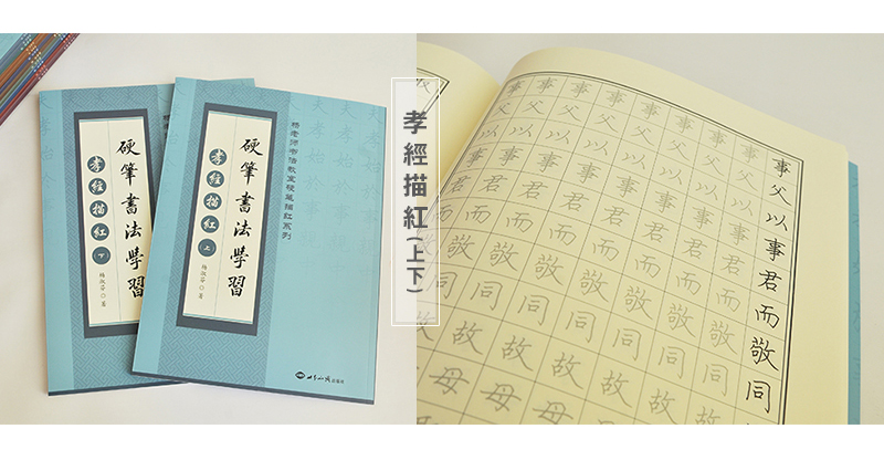 《孝經描紅》(上、下冊) 為楊淑芬老師硬筆書法教學法最新描紅本。內容選自儒家十三經之一。中華民族自古重視孝道。人之有孝若樹之有根,唯有根深才可枝繁葉茂。民族之智慧,也要靠代代承傳,方延綿不衰。