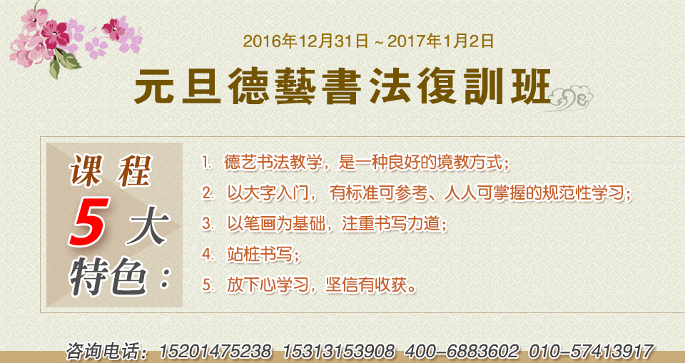 2016年12月31日~2017年1月2日,北京誠敬仁特開辦為期三天的德藝書法復(fù)訓(xùn)班,教學(xué)指導(dǎo)老師為北京誠敬仁著名書法教育家楊淑芬老師培養(yǎng)的優(yōu)秀書法老師。歡迎廣大書法愛好者不要錯過此提升的良機(jī),相信在與老師和學(xué)友們面對面的交流學(xué)習(xí)中,在執(zhí)教經(jīng)驗(yàn)豐富的老師們的引導(dǎo)下,您能迅速地找出學(xué)習(xí)中的不足,并在共同學(xué)習(xí)的良好氛圍中集中心力突破書學(xué)的瓶頸,不但有增上書藝之功,更讓自己的身心靈在傳統(tǒng)文化的墨香意蘊(yùn)中度過一段別樣的旅程。