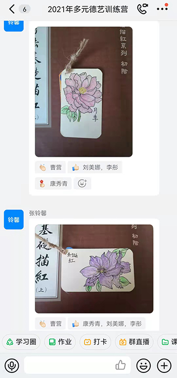 藝術實踐包含:軟硬筆書法、中國經典、定心描紅、彩繪人生、太極拳、美文朗誦等。