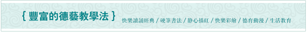 楊老師書法教室在教學(xué)中,承傳楊淑芬老師注重德藝雙修的教風(fēng),強調(diào)練習(xí)書法:「七分德,三分藝?!棺⒅卦⒔逃跇?,在學(xué)習(xí)書法長養(yǎng)靜定功夫的同時,通過豐富多彩的德藝教學(xué)法——讀誦經(jīng)典、德育動漫、硬筆書法、靜心描紅、快樂彩繪等方式,幫助學(xué)生在豐富多彩的教學(xué)環(huán)境中得定,同時在生活中給予學(xué)生悉心引導(dǎo),帶領(lǐng)學(xué)生們腳踏實地踐行德藝教學(xué),讓孩子們在快樂的學(xué)習(xí)氛圍中領(lǐng)悟傳統(tǒng)文化的精神內(nèi)涵。