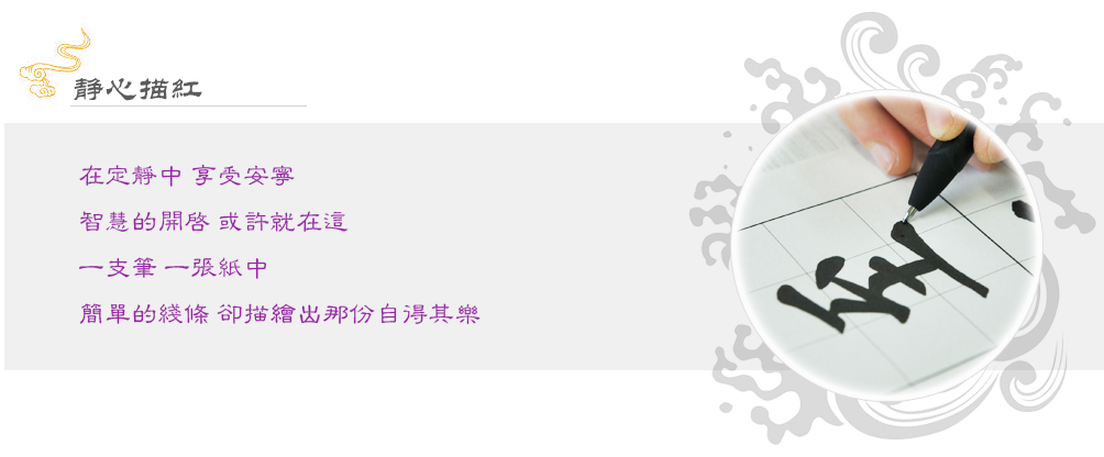古人所謂的描紅,是指在空心字中摹寫,因輪廓線為紅色,故稱描紅。自古以來,描紅常為教育幼兒習(xí)字及識字之方,也為書法奠下厚實根基。楊老師書法教室的「定心描紅」則化繁為簡,不須毛筆,只用鉛筆或一般書寫筆即能隨時練習(xí),且功效神奇。特別是對好動的孩子,效果更佳。此法經(jīng)海內(nèi)外數(shù)年的實踐證實,特能幫助不定與心浮氣躁的孩子,取法重在定心,且在描中能生起一股信心,在一筆一劃中逐漸過濾自心的散亂與浮躁,進而契入書學(xué)的妙趣。