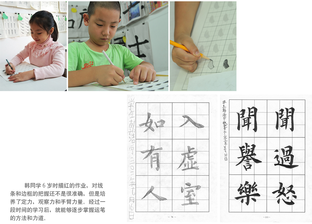實例一:涵同學(xué)今年7歲,北京誠敬仁楊老師書法教室」的學(xué)生,沒學(xué)習(xí)描紅之前是個脾氣暴躁,精力旺盛的小男孩。脾氣一上來,誰的話都不聽,令家長和老師們都十分頭疼。接觸定心描紅后,孩子焦躁的情緒漸漸穩(wěn)定下來,只要握起描紅的筆,孩子就乖巧安靜地專注于一筆一劃的描紅中,渾然忘我。經(jīng)過一段時間的學(xué)習(xí),孩子不但性情變得溫和有禮了,而且愛上了描紅,同時培養(yǎng)了良好的靜定能力,描好的作品如同印刷出來一般工整干凈,令家長和老師都頗感欣慰。