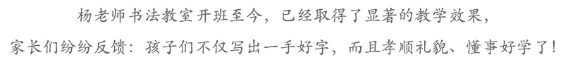 楊老師書法教室的小朋友,進入小學(xué)之后,能輕松適應(yīng)小學(xué)的學(xué)習(xí)環(huán)境,專注力強,學(xué)習(xí)自覺,自信心足。