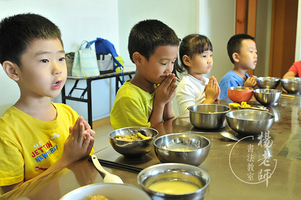 “陽陽,粥現(xiàn)在還有點燙,我們先放在一邊讓它涼著。現(xiàn)在我們先念餐前感恩詞。”