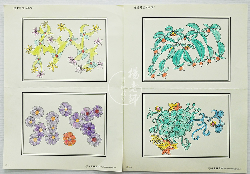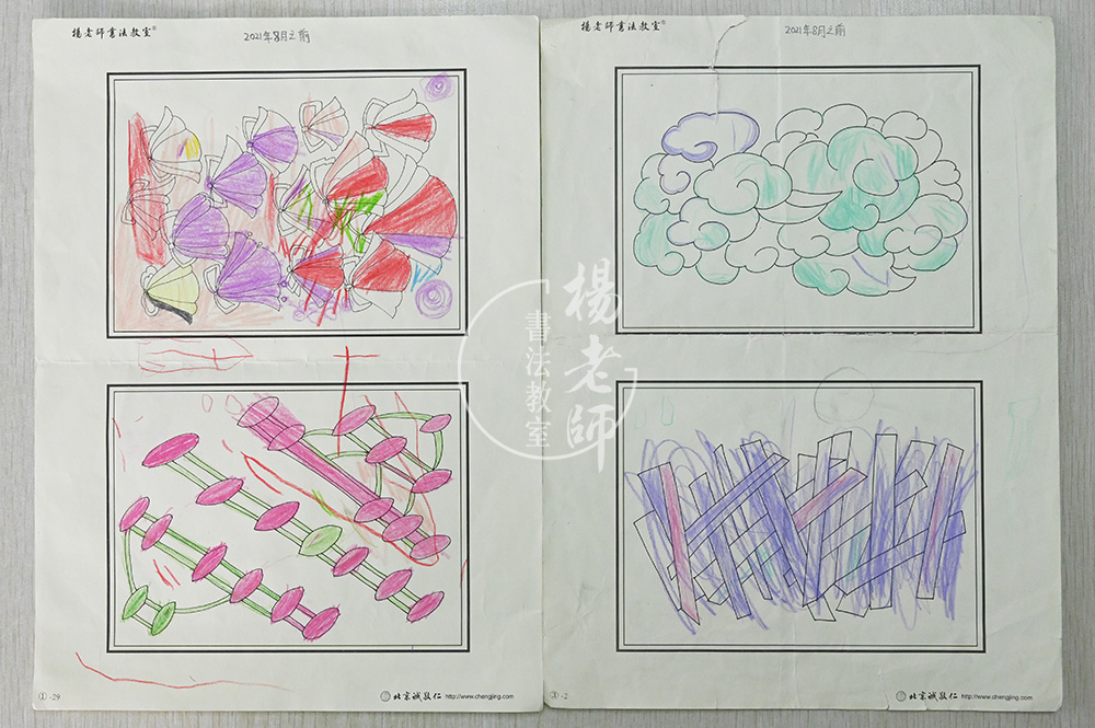 桐桐的變化之大,歸功于媽媽與老師的緊密配合,每日督導桐桐堅持兩到四張左右的描紅,正是因為有了一定數量的描紅積累,桐桐的心慢慢沉靜下來,性格越來越柔和,小手也對筆的把控能力越來越強,再來彩繪的時候,線條的粗細密度,不出邊框的把控度也越來越進步,下面分享一組桐桐前后描紅與彩繪的對照: