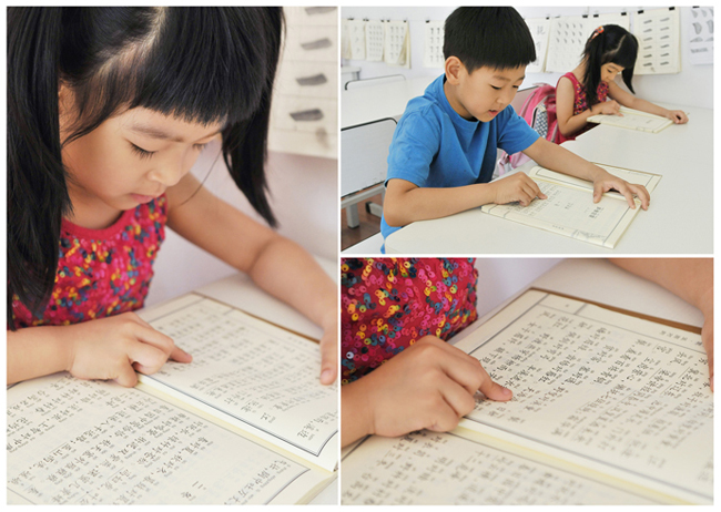 孩子們的識字能力是從每天的經典誦讀鍛煉出來的。對于三歲多的驊兒,從未接觸過的《弟子規》《三字經》《百家姓》《聲律啟蒙》《笠翁對韻》等經典,攤開在她面前無異看天書。在學長們瑯瑯的讀書聲中,她茫然無措地看著眼前的書,不知道該怎么辦。老師便教她從指字開始,學長讀一個字,她就指一個字,隨著學長的讀誦,她要努力跟著指字。在幾十遍上百遍的讀誦中,她慢慢地也能跟著讀誦一個字,兩個字,甚至一句話,兩句話。到現在,她居然能跟隨大伙兒,讀上一段話,兩段話了呢。