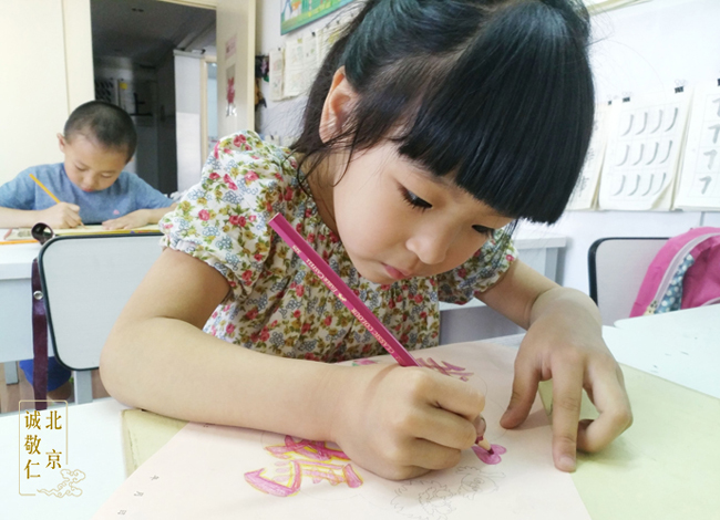 另外,在書寫,描紅,彩繪方面,驊兒的定力進步是非常明顯的。現在驊兒半天課程能寫十幾張水寫帛,描紅一次能描一張或一張半,這對于成人來講也是相當具有挑戰性的,所以說驊兒真的很不簡單了。