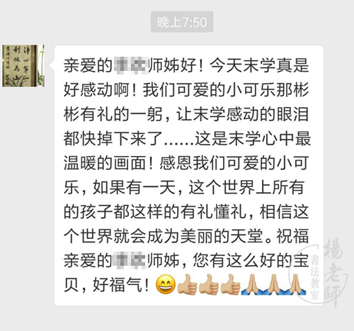在這樣點點滴滴不斷的熏習下,孩子們就算是在外面也學會了主動問好的好習慣,其中一位家長給書法教室周老師的留言——