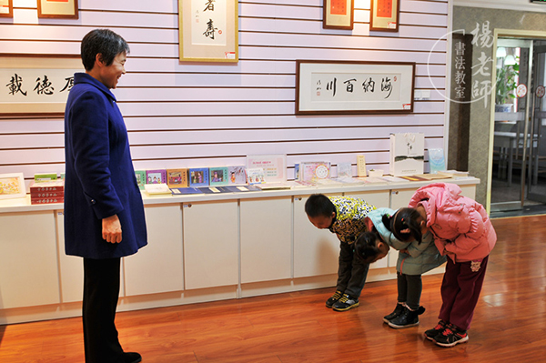 「楊老師書法教室」的孩子們從每天剛剛進門開始,就要學會主動與老師們問好,再向長輩感謝、再見。往往剛入學的孩子很不習慣行鞠躬禮,小小的腰背和頭總是很難彎下去,老師會耐心的一次又一次的反復演示指導,直到動作做規范了方可過關。因為有了老師這樣嚴謹而認真的態度,再到以后的要求中,孩子們就會多了一份認真對待。