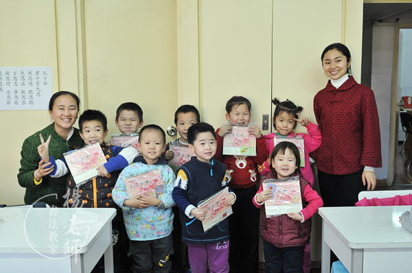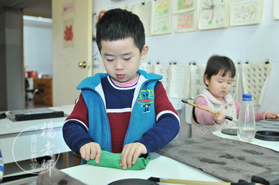 剛來書法教室的孩子還不習慣行鞠躬禮,每當大家都莊嚴肅立時,他總是東躲西藏,非要老師拽著他,才能安定,老師看著他的眼睛嚴肅地說:“要做對的事,我們一起向夫子爺爺鞠躬,請求夫子爺爺幫助我們成長。”經過一星期的訓練,他終于可以超常發揮,安定地行禮了。