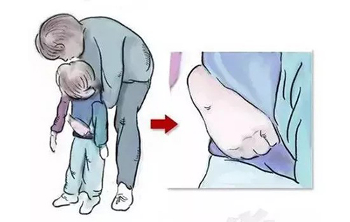 2.另一只手托住孩子后頸部,讓其臉朝下,趴在救護人膝蓋上;