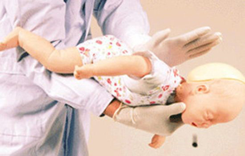 1.馬上把寶寶抱起來,一只手捏住顴骨兩側,手臂貼著孩子的前胸;