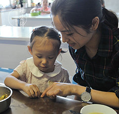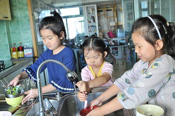 二十分鐘左右,孩子們陸續用完餐,離座前,老師引導孩子們將餐桌上的殘渣放入碗中再離座。下位后,孩子們向仍在用餐的老師、同學鞠躬道:“我吃飽了,大家請慢用。”接著緩緩地走到廚房洗碗。老師時常叮囑孩子們:“珍惜水資源,做節水寶寶”,因此孩子們開水龍頭時會有意識地調節水流,不敢浪費。在老師的帶領下,孩子們每天都會溫習洗碗的步驟,直到生活好習慣內化為他們生命中不可或缺的一部分。
