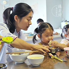 有孩子吃飯聲音太響,老師教導孩子改正用餐方法,不用力啜飲湯汁,而是用勺送湯入口,自然而又無傷大雅。