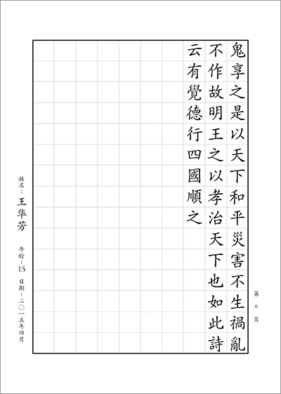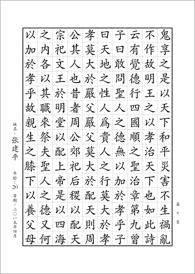 青年和成人組書寫內容:書寫正體字版《孝經》1—12章 (共計9頁;合計1296字)。