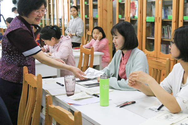 張女士在硬筆國畫課,她對自我要求很高,