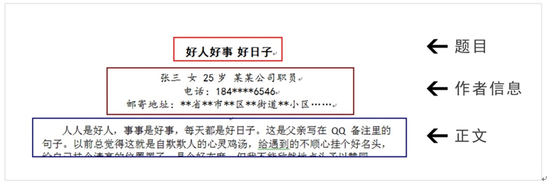 4.題目下方用楷體四號標注:作者姓名、性別、年齡、工作單位或學校年級、聯系電話和通信地址;