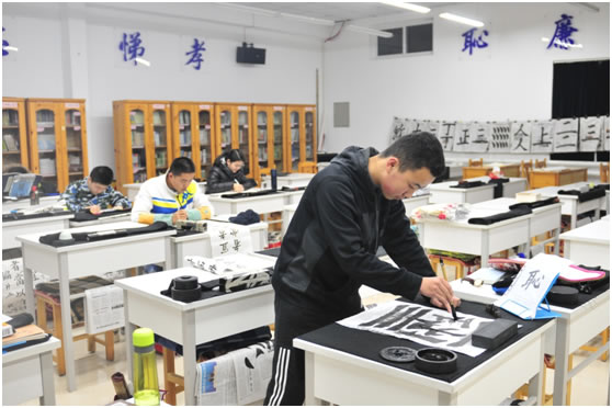 晚上,無(wú)論是去教室還是去宿舍,看到最多的場(chǎng)景就是大家凝神貫注的在練習(xí)毛筆書(shū)法。或點(diǎn)橫撇捺,或一筆一畫(huà)。
