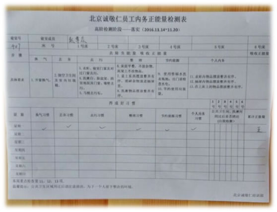 下面這張表是自我檢測(cè)表,除了生活老師抽檢內(nèi)務(wù)外,自己給自己評(píng)分,對(duì)比看哪些做到了,哪些沒(méi)有做到。