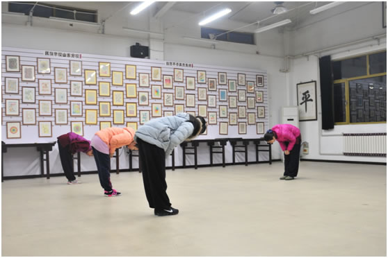 無(wú)論是在戶外還是在太極館,早晨你總能看到同學(xué)們矯健的身姿。在戶外,新六藝般的同學(xué)在短促有力的:1-2-1,1-2-1口令中,圍著小院跑步,連續(xù)至少跑十圈,很感覺(jué)這象軍訓(xùn),然而這是他們每天的必修課。